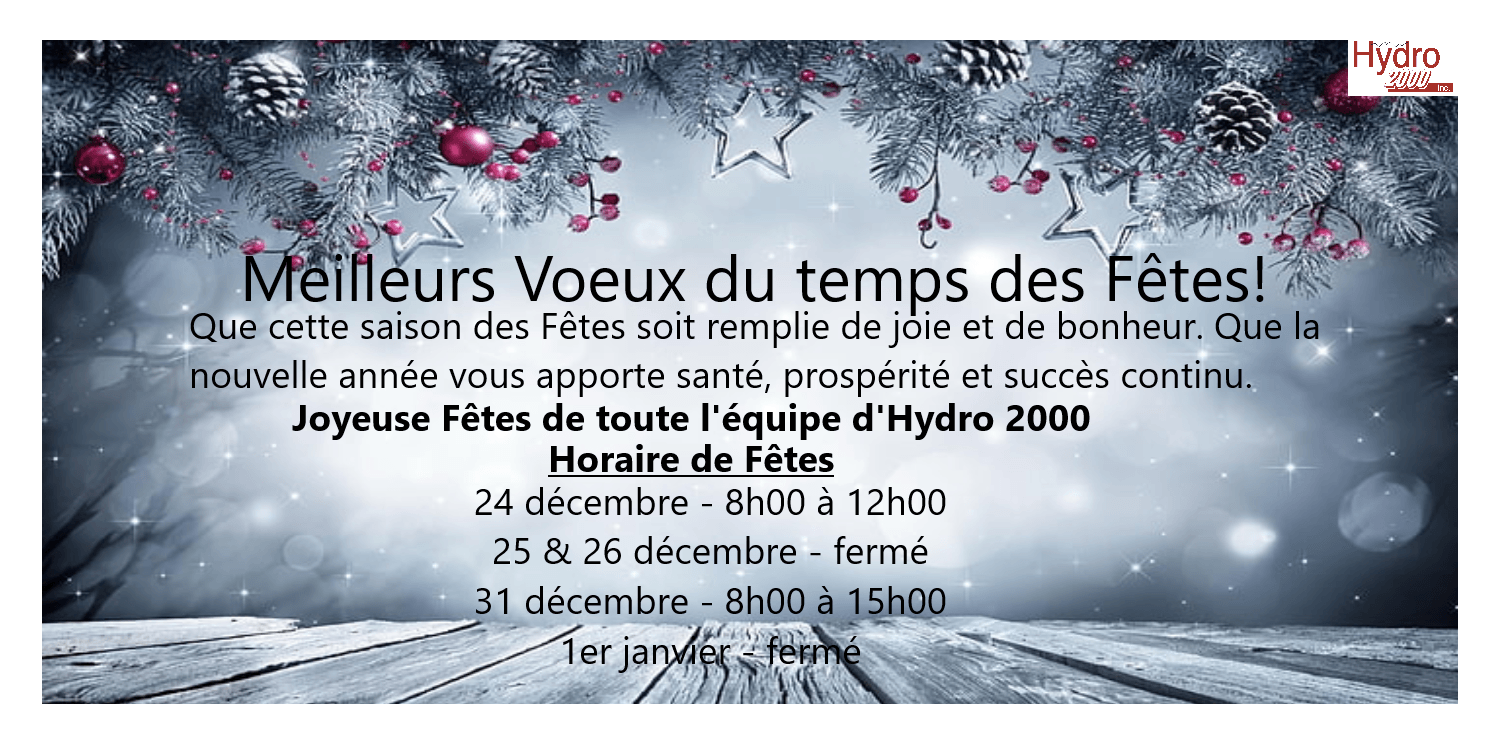 Joyeuse Fêtes! Horaire du temps des Fêtes! Hydro2000-Info décembre 10, 2025Non classifié(e) Christmas Hours 2024 (FR)